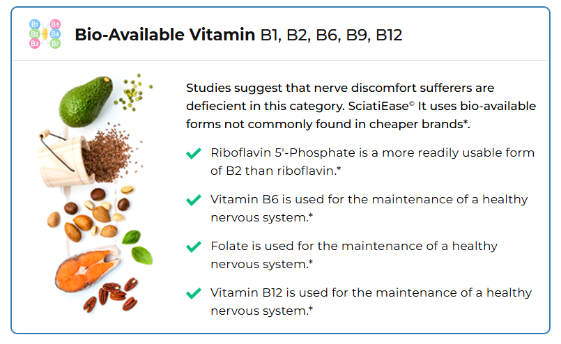 SciatiEase is not just another painkiller that hides symptoms. It goes deeper – right to the real cause of sciatic nerve pain. According to recent studies, pain in the lower back, hips or legs may be linked to a deficiency of three essential vitamins. And that’s exactly what SciatiEase was developed for.