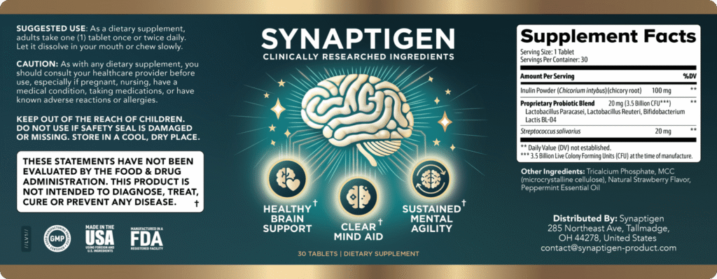 Synaptigen combines a unique blend of probiotics, prebiotics, and natural plant extracts that work synergistically to restore optimal neural communication, enhance focus, and improve cognitive performance. The formula is specifically designed to target the root causes of cognitive decline by reducing sugar buildup in neural pathways and supporting healthy brain-gut balance. It helps maintain clear thinking, strong memory, and steady mental energy — contributing to long-term brain health and sharper focus.